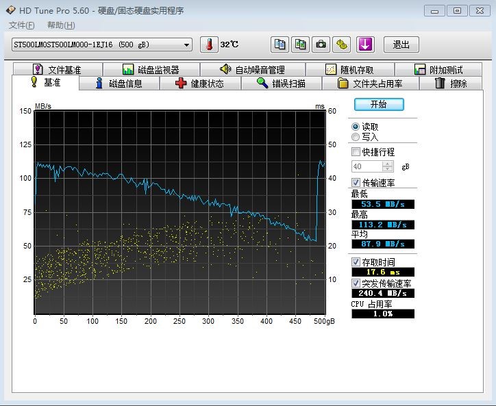 接下來我們分別用HD Tune Pro和Crystal Disk Mark兩款軟件來測試希捷500GB SSHD的具體性能是怎樣的,我們會連續進行幾次測試來確定 SSHD的最大性能值,并且我們會放成績圖供大家參考。