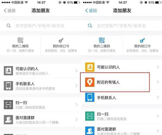 支付寶,這個大家伙都熟知常用的支付工具近期又爆大新聞!據國內某知名媒體向支付寶官方求證,支付寶已將曾經愚人節(jié)惡搞視頻中的“附近有錢人”功能變?yōu)楝F(xiàn)實,并計劃將于今年9月底10月初發(fā)布使用!這不禁讓人想起一句話“搞笑,我們是認真的!”你以為我們是在搞笑?怎么可能!我們可是正正經經的社交媒體(哎呀,一不小心,說出了馬云爸爸的心聲)。
