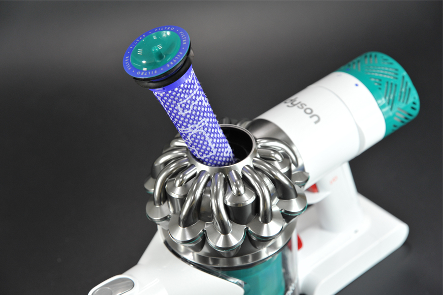 雙層放射式氣旋(左圖),通過強大的離心力把灰塵留在集塵桶中,氣旋中央的空氣則通過濾網(右圖)過濾,避免二次污染,濾網也可以直接水洗,十分省事