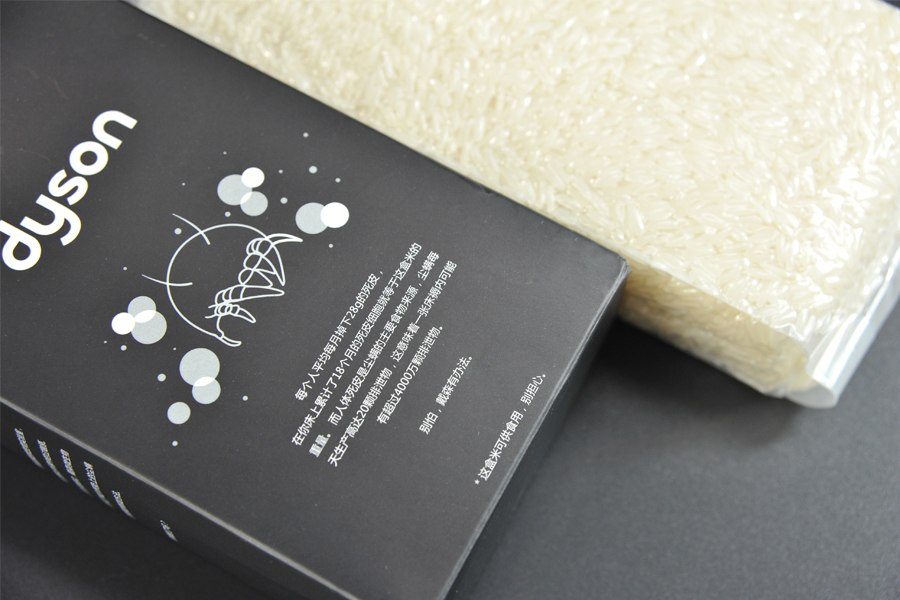 按理來說,到這里開箱就應該結束了,但是小編還有個細節想要分享給大家。戴森在V6 Mattress的外包裝上附贈了一袋500克的米以及一句話,大意就是:“人體每天都會有28g的死皮脫落,而18個月的死皮累計起來相當于這袋米的重量”。看起來還是挺觸目驚心的。