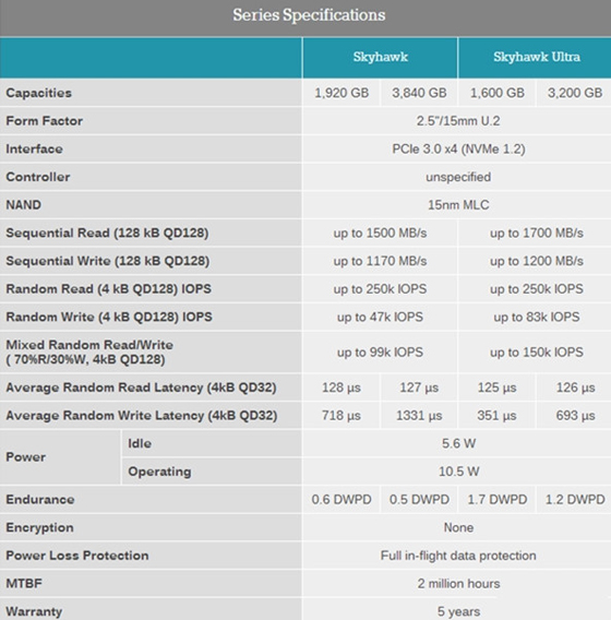 Skyhawk系列固態硬盤有Skyhawk標準版系列和Skyhawk Ultra加強版兩個子系列。Skyhawk標準版系列有1920GB、3840GB兩個容量版本,持續讀寫最高1.5GB/s、1.17GB/s,4KB QD128隨機讀寫最高250K IOPS、47K IOPS,混合隨機讀寫最高99K IOPS,4KB QD32平均隨機讀寫延遲128/127微秒、718/131微秒,支持每天0.6/0.5次全盤寫入。