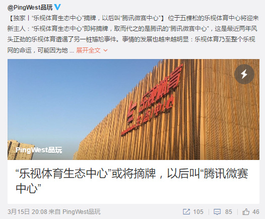 據新聞媒體品玩3月15日報道,位于五棵松的樂視體育中心將迎來新主人:“樂視體育生態中心”即將摘牌,接盤者是騰訊(或名“騰訊微賽中心”)。鑒于以往品玩與樂視有過撕逼史,我們立馬會想到樂視不會對品玩的報道坐視不理,紛紛準備好板凳、瓜子看戲。