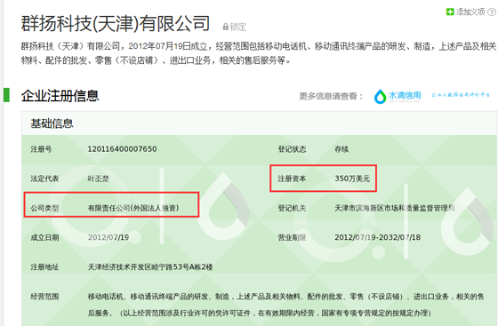 我們仔細看一下夏普手機官微的認證信息:群揚科技(天津)有限公司,一個中文名字,小編開始以為是個冒牌貨,于是我查看了一下該公司的注冊信息,公司的類型屬于外國法人獨資的有限責任公司,看樣子應該是真的。