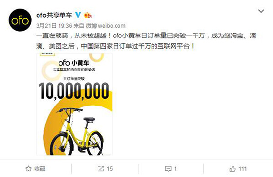昨晚19:36分左右ofo共享單車官方發布微博正式對外宣布:“ofo小黃車日訂單量已突破一千萬,成為繼淘寶、滴滴、美團之后,中國第四家日訂單過千萬的互聯網平臺!”