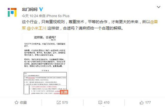 今天出門問問發了條微博質問小米,引起軒然大波,出門問問說“這個行業,只有重視規則,尊重技術,平等的合作,才有更大的未來,所以@雷軍@小米王川這樣做,合適嗎?請麻煩給一個合理的解釋。”并放出一張長截圖解釋說明。
