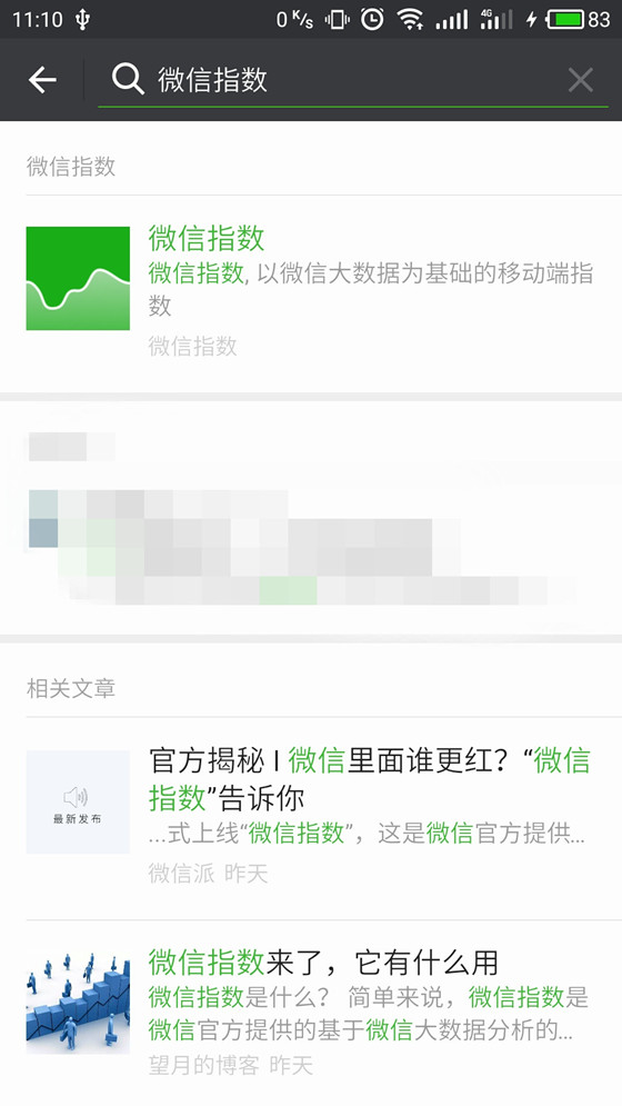 在微信客戶端頂部的搜索欄中,搜索“微信指數”,即可看到微信指數的入口。