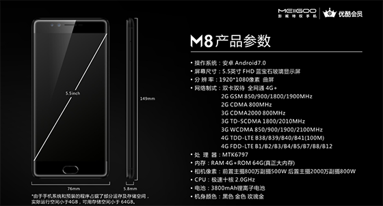 打開M8的產品宣傳界面,發現該手機在產品的背面印有優酷會員與魅果的logo,表示這是一款定制手機。
