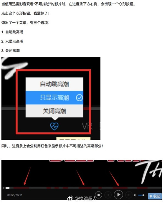 據@挨踢超人 描述,迅雷旗下的迅雷影音觀看某“不可描述”影片時,在進度條下方的右側會出現一個心形按鈕,點擊心形按鈕,彈出了菜單,有自動跳高潮/只顯示高潮/關閉高潮三個選項菜單,同時進度條上會用紅色來標示不可描述的高潮部分。