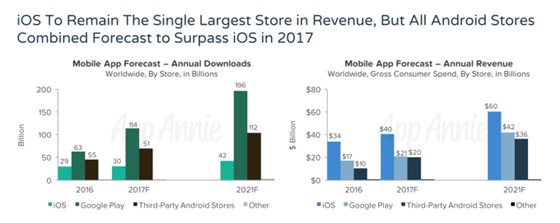 App Annie預測,到2021年全球移動應用下載量將超過3520億,所有應用商店的消費支出總額將超過1390億美元。而iOS App Store將占據這一收入的大部分,預計將達到600億美元,而Google Play則預計為420億美元,第三方商店則很有可能達到360億美元。