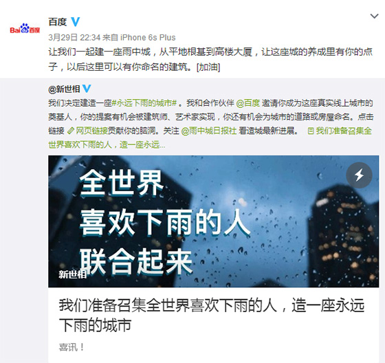 昨天新世相官微發文正式宣布將聯合百度發起建立雨中城活動,利用AR全景街景技術,讓雨中城安放在百度地圖上,雨中城會得到一個現實中的坐標,這樣每個人都可以進入,像哈利波特中的九又四分之三站臺那樣。百度轉發了該微博文章表示欣然同意。