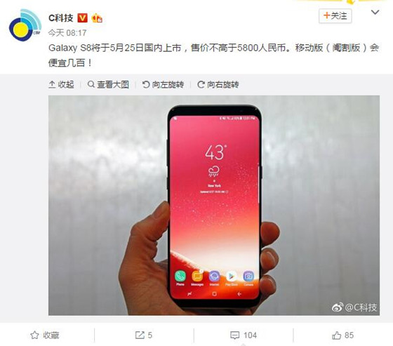 三星S8/S8+國行發(fā)售日期曝光 售價(jià)或?qū)⒂畜@喜