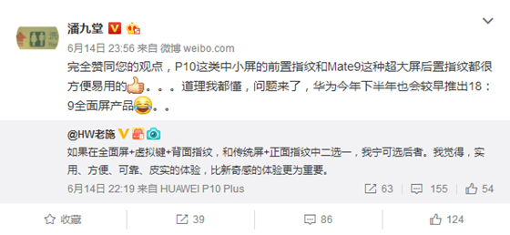 分析師“潘九堂”在微博稱:“P10這類中小屏的前置指紋和Mate9這種超大屏后置指紋都很方便易用的[good]。。。道理我都懂,問題來了,華為今年下半年也會較早推出18:9全面屏產品。。”