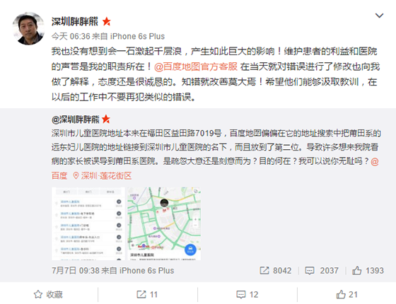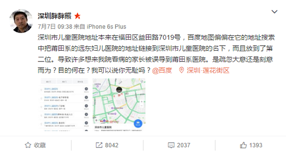 7月7日上午,微博一位網友@深圳胖胖熊發文稱在百度地圖搜索深圳市兒童醫院地址,百度地圖把它的地址搜索中把莆田系的遠東婦兒醫院地址鏈接放在深圳市兒童醫院的名下,而且放到了第二位。導致許多來深圳市兒童醫院看病的家長被誤導到了莆田系醫院。