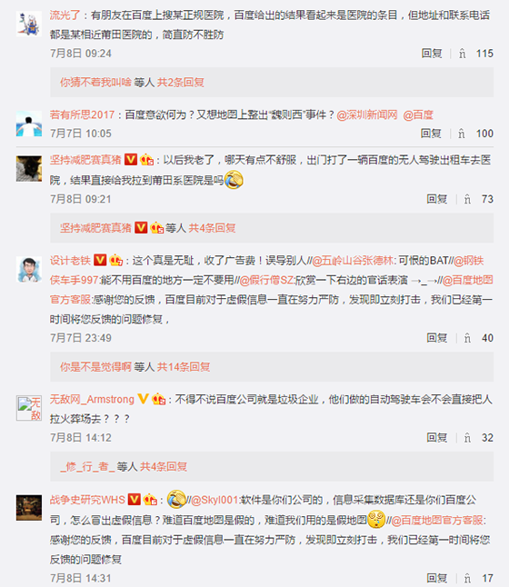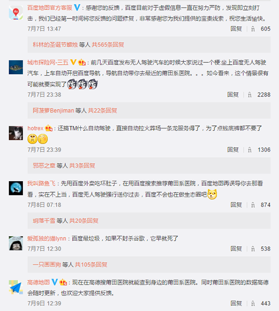 此微博瞬間引起了大眾的關注,下面的微博評論以一面倒的趨勢進行吐槽,網友紛紛說出了自己遇到過的或者見到過的百度地圖的糟糕體驗,或者純粹是針對于百度曾經的惡劣行徑進行批判嘲諷。