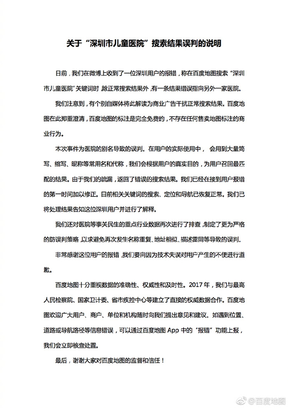 隨即,百度地圖官方微博針對此事作出了回應,針對于此事,百度地圖稱道:本次事件為醫院的別名導致的誤判,在用戶的實際使用中,會用到簡寫、縮寫、昵稱等常用名和代稱,我們會根據用戶的真實目的,為用戶召回最匹配的結果。由于我們的疏忽,返回了我們的錯誤結果。我們已經在接到用戶報錯的第一時間加以修正。