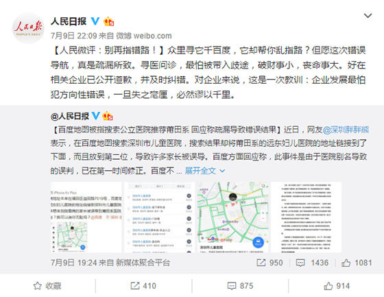在當天夜晚,人民日報也發文進行評論:別再指錯路。眾里尋它千百度,它卻幫你亂指路?但愿這次錯誤導航,真是疏漏所致。尋醫問診,最怕被帶入歧途,破財事小,喪命事大。好在相關企業已公開道歉,并及時糾錯。對企業來說,這是一次教訓:企業發展最怕犯方向性錯誤,一旦失之毫厘,必然謬以千里。
