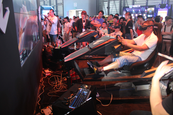 在VR賽車體驗區,不少人排著隊來體驗沉浸感十足的4D游戲體驗。