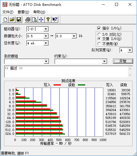 在ATTO的測試中,可以看到最大寫入速度約537.9MB/s,最大讀取速度約564.1MB/s,完全達到了其宣傳的速度。