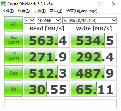 測試結(jié)果顯示,硬盤的讀取速度為563.4MB/s,寫入速度為534.5MB/s,成績不錯。