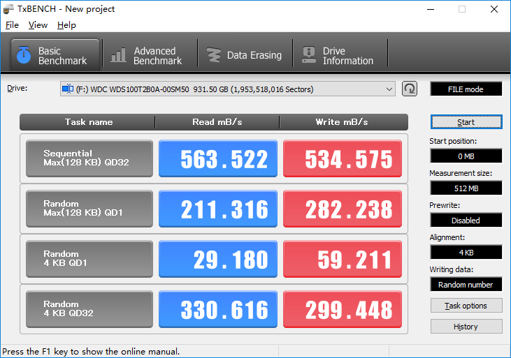 在默認設置的測試項目中,這塊硬盤的讀寫速度分別達到了563.5MB/s和534.6MB/s,表現(xiàn)良好。