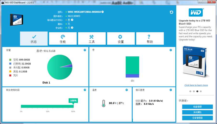 WD SSD 儀表板主要用于監(jiān)控硬盤當前的運行狀態(tài)和一些相關(guān)信息。