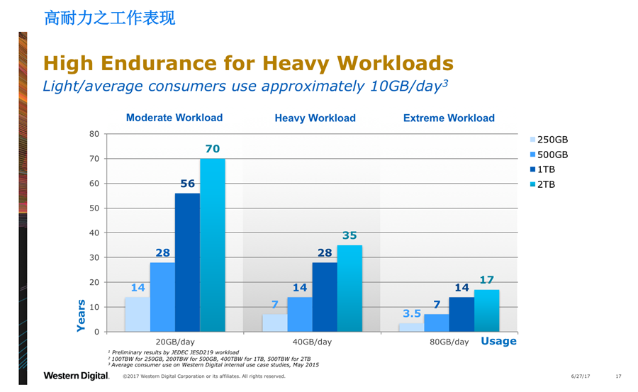 與此同時,WD 3D NAND SATA SSD固態(tài)硬盤各個容量的版本在耐久性上也有良好的表現(xiàn),250GB:100 TBW、500GB:200 TBW、1TB:400 TBW、2TB:500 TBW,足以滿足絕大多數(shù)用戶的使用需求。