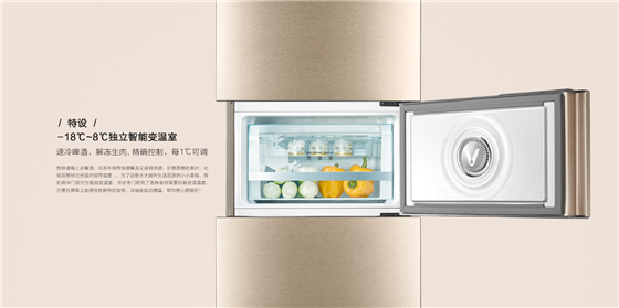 云米互聯網智能冰箱iLive設置了一個體積為41L的變溫室,只要在屏幕上選擇你想要保存的食物,冰箱就會自動調溫,使其保鮮更完美。這個也是近些年非常流行的一個設計,也稱為中門變溫室,中幅變溫室,變溫抽屜等。有一些食材冷藏溫度不合適,冷凍溫度不合適,這時候就要使用到變溫室了,你可以獨立設置一個溫度來保鮮此物。云米此款冰箱的獨立智能變溫室的亮點體現在智能上面,它把資料存儲在其中,你要存什么食物,它可以根據你的選擇來調節合適的溫度,而其他品牌的變溫室需要你自己設置一下溫度。