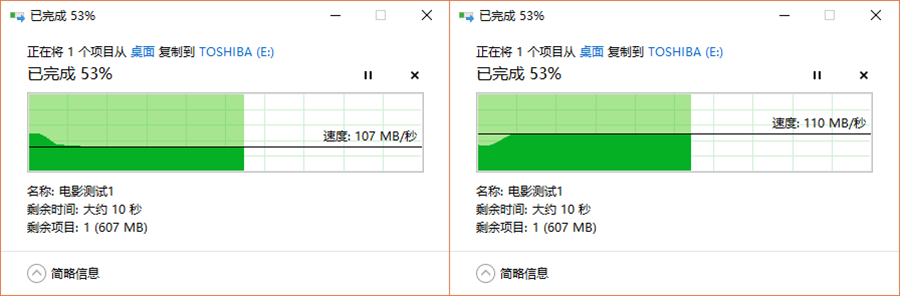 左側將電影文件由PC端拷貝到U盤,右側通過奧睿科透明集線器,將電影文件由PC端拷貝到U盤,測試結果基本相同。
