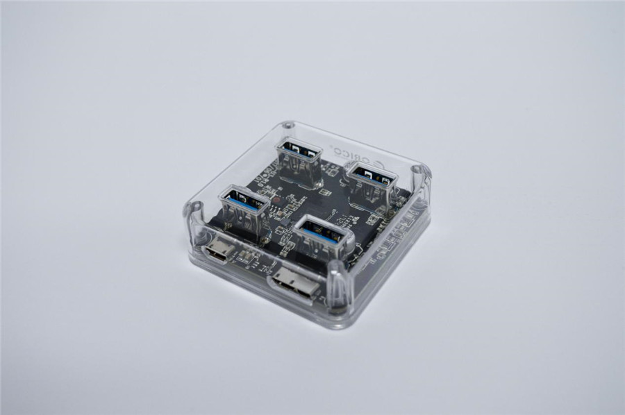 奧睿科透明集線器全機身一共有6個接口,其中四個為USB3.0接口,一個為Micro-B接口,最后一個為Micro USB供電接口,保證每個USB3.0接口可輸出5V,900mAh的足量電量。