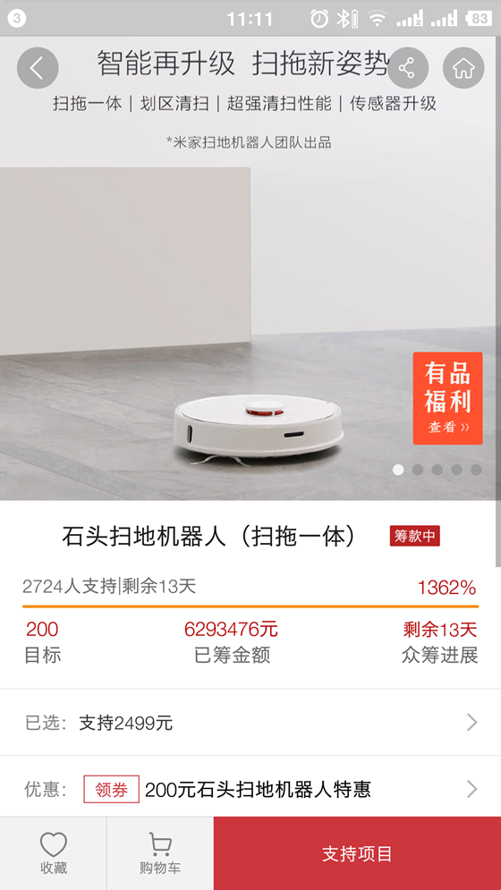 石頭掃地機器人(掃拖一體)定價2499元,眾籌全款可領200元優惠券,券后2299元的價格雖然相比一代價格上漲了一些,但功能也更強大,性價比依然很高。