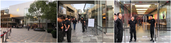 蘋果西湖店門口黑壓壓的一片排隊護欄也被默默拆去,數量眾多的安保人員陣勢驚人。