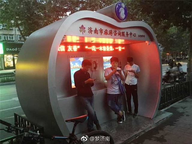 國(guó)內(nèi)很多城市都有提供旅游咨詢的街頭服務(wù)設(shè)施,通常會(huì)提供公共電話、旅游查詢等功能。但隨著智能手機(jī)的普及,這些旅游咨詢?cè)O(shè)施的功能被取代,大多數(shù)漸漸成為“擺設(shè)”,很多地方也在嘗試對(duì)其進(jìn)行改造。近日,濟(jì)南街頭的一個(gè)大蘋(píng)果造型的“旅游咨詢服務(wù)中心”與時(shí)俱進(jìn)地添加了充電服務(wù)和無(wú)線Wi-Fi功能,大大增加了其實(shí)用性,得到了不少過(guò)路市民的垂青。