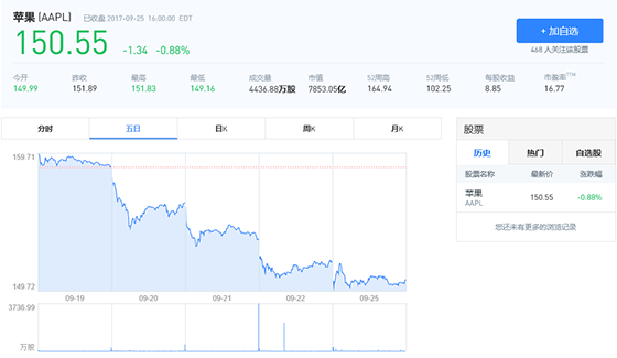 美國時間9月11日,就是蘋果發布會前夕,蘋果當時市值約為8349億美元,而 9月25日收盤時候,蘋果的市值已經下跌至約7778億美元。根據市場反響來說,由于iPhone8以及iPhone8 Plus低于預期的銷售狀況,導致蘋果股價一路下跌,這已經是過去十個交易日里面的第八個下跌了。