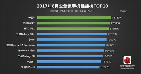 在iPhone8出來的時候,安兔兔官網已經針對A11進行了跑分,總分為226058,而以8月份手機性能排行榜的榜首一加5的得分才181507分。雖說跑分已經是遠超對手,但是其真正的最大優勢卻不在于此,它的最大優勢是系統帶來整體的優越性。