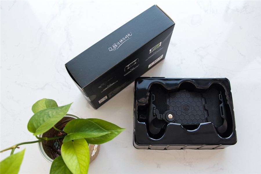 打開包裝,可以看到一個黑色吸塑卡住手柄,手柄外觀黑色磨砂硬塑材質,而吸塑為光面材質,襯托起來具有科技感。