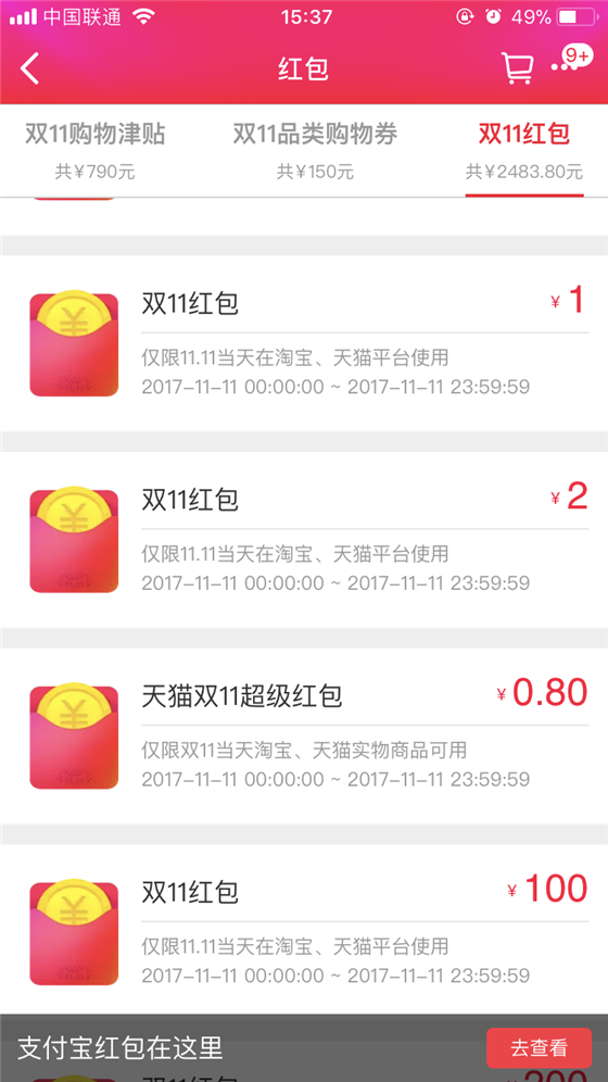 還有一個(gè)今年很新穎買(mǎi)紅包送紅包,小編買(mǎi)了2400塊錢(qián)的紅包目前就送了20元紅包再加幾個(gè)普通火炬紅包。不過(guò)唯一安慰的是,11.11如果此紅包用不完會(huì)變成現(xiàn)金自動(dòng)回到你的支付寶。