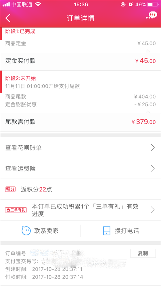 今年最先出來(lái)的是“定金”,先付定金會(huì)有一個(gè)定金膨脹,而且可以在付尾款的時(shí)候使用優(yōu)惠券,是不是很劃算?但是請(qǐng)看下面,你的訂單編號(hào)已經(jīng)生成,表示此產(chǎn)品不能與其他商品共同享用滿減優(yōu)惠了。