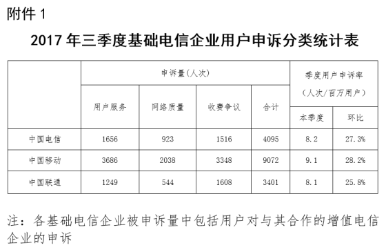 通告附上了第三季度三大運營商用戶申訴分類統計表,可以看到三大運營商季度用戶申訴率環比均有增長,其中中國移動9.1人次/百萬用戶的申訴率為三大運營商中最高。