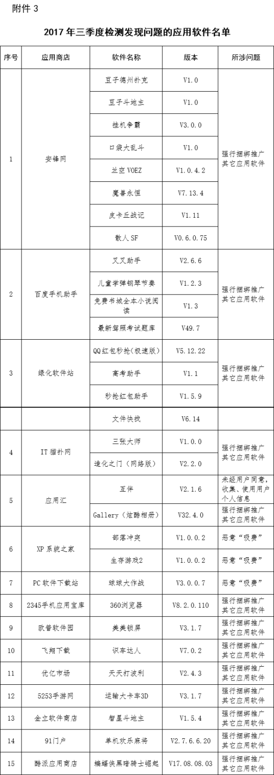 此外,通告還附上了三季度檢測發現問題的應用軟件名單,用戶在下載軟件的時候需多加留意。