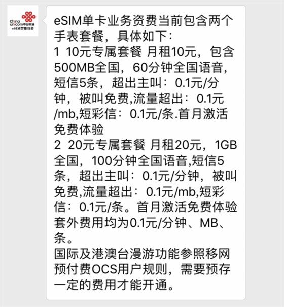 關于資費方面,聯通方面也定下來,具體會有10元專屬套餐與20元專屬套餐,國際及港澳臺需預存一定費用才可開通。