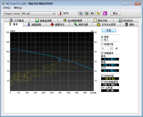 HDT中40GB大行程讀寫(xiě)測(cè)試平均都在80MB/s,不過(guò)對(duì)于5mm厚度的移動(dòng)硬盤(pán)來(lái)說(shuō)這也算是比較不錯(cuò)成績(jī)。