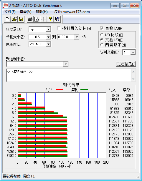 從上圖中我們不難看出,希捷Seven便攜式硬盤(pán)在ATTO DiskBench測(cè)試中,最大讀取速度達(dá)到113.1MB/秒,寫(xiě)入速度達(dá)到112.8MB/秒。