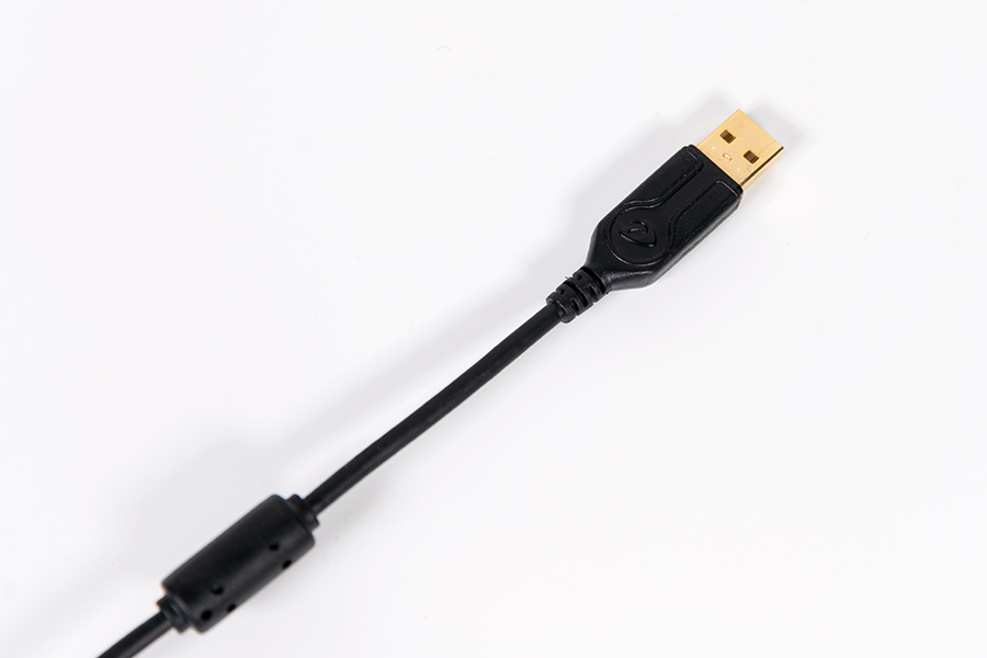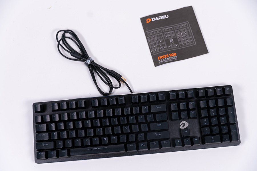 將目光焦點對準我們的產品主角,達爾優EK925 RGB鍵盤采用了108鍵布局,為懸浮式設計,從平視角度看還能直接看到鍵盤的軸體,這樣的設計也有利于呈現出更好的透光效果。數據線與鍵盤連為一體,黑色橡膠材質,線長約為1.8m,線材配有抗干擾磁環和理線帶,USB接口為鍍金設計。