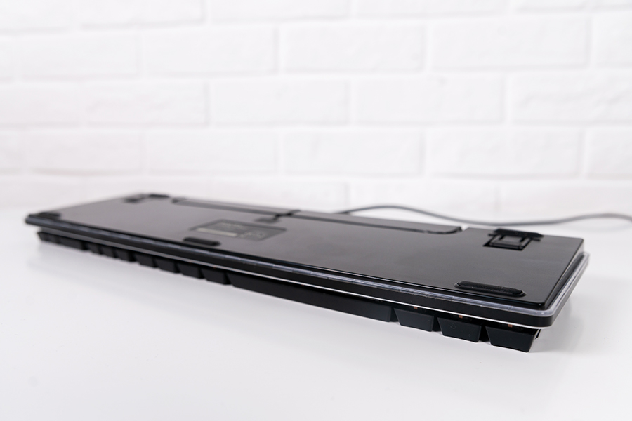 鍵盤的底部設有5個弧形的防滑橡膠貼,鍵盤底部出線口設有走線槽,而且還做了加固處理。左上和右上角各有一個腳墊可向上抬起。