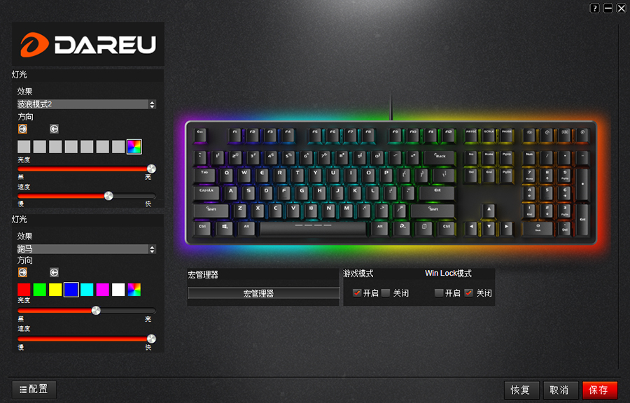 想要變化RGB燈效不僅可以通過組合鍵來實現,這款達爾優EK925RGB機械鍵盤還可在官網下載鍵盤的驅動支持,安裝驅動后自定義鍵盤的RGB光效變化,并且可以自定義調節宏鍵、組合鍵等功能,不過這個驅動界面稍顯簡陋,未來如果能更新一下驅動內容或許能開發出一些新玩法。