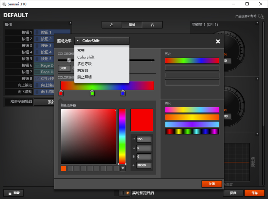 雖然在賽睿官方的SteelSeries Engine驅動軟件許多強大的擴展性能并不能在賽睿Rival 310游戲鼠標上得到使用,不過還是能在這款驅動軟件上實現更換燈效,自定義編程按鍵以及更改鼠標靈敏度,RGB燈效的修改可以實時預覽。這些核心功能足以應付平日的游戲操作,要再多一些花里胡哨的功能那就只能加錢購買更高級的鼠標啦。