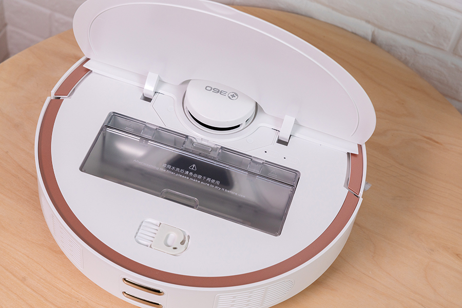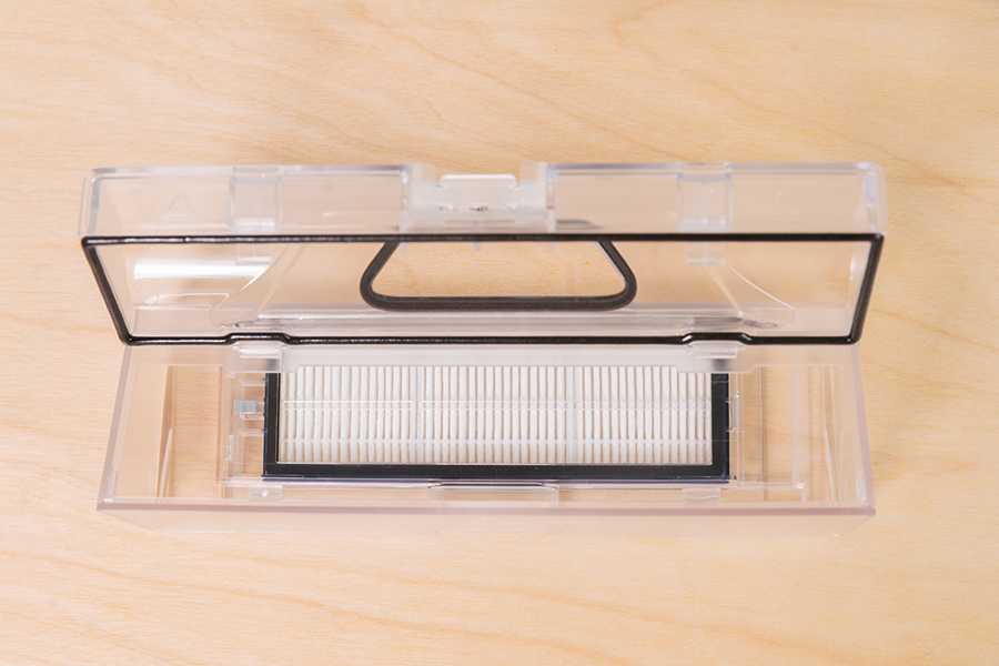 揭開S7主機的上蓋,我們可以看到有一個570ml容量的塵盒。這個塵盒采用HEPA濾網(wǎng),并可拆卸清洗更換,將濾網(wǎng)晾干后便能投入下一次使用,并且還有一個小型的除塵刷放置在上蓋的內(nèi)測區(qū)域,在清潔濾網(wǎng)可就地取材。