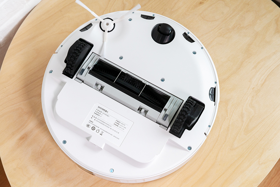 在S7的背面也有4個防跌落的傳感器,除了傳感器外還有負責移動方位的兩個主輪和萬向輪,以及主刷和清掃邊角的啟塵刷。如果將卡口拿起,就可以把主刷拿出來進行清潔工作。