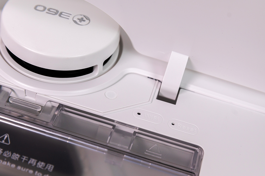 在濾網(wǎng)的右上角有WiFi和Reset兩個按鈕,通過WiFi按鈕我們就能通過手機的360智能APP將掃地機器人連上家里的WiFi網(wǎng)絡,實現(xiàn)APP的操控功能,Reset也好理解,就是重置還原默認狀態(tài)。