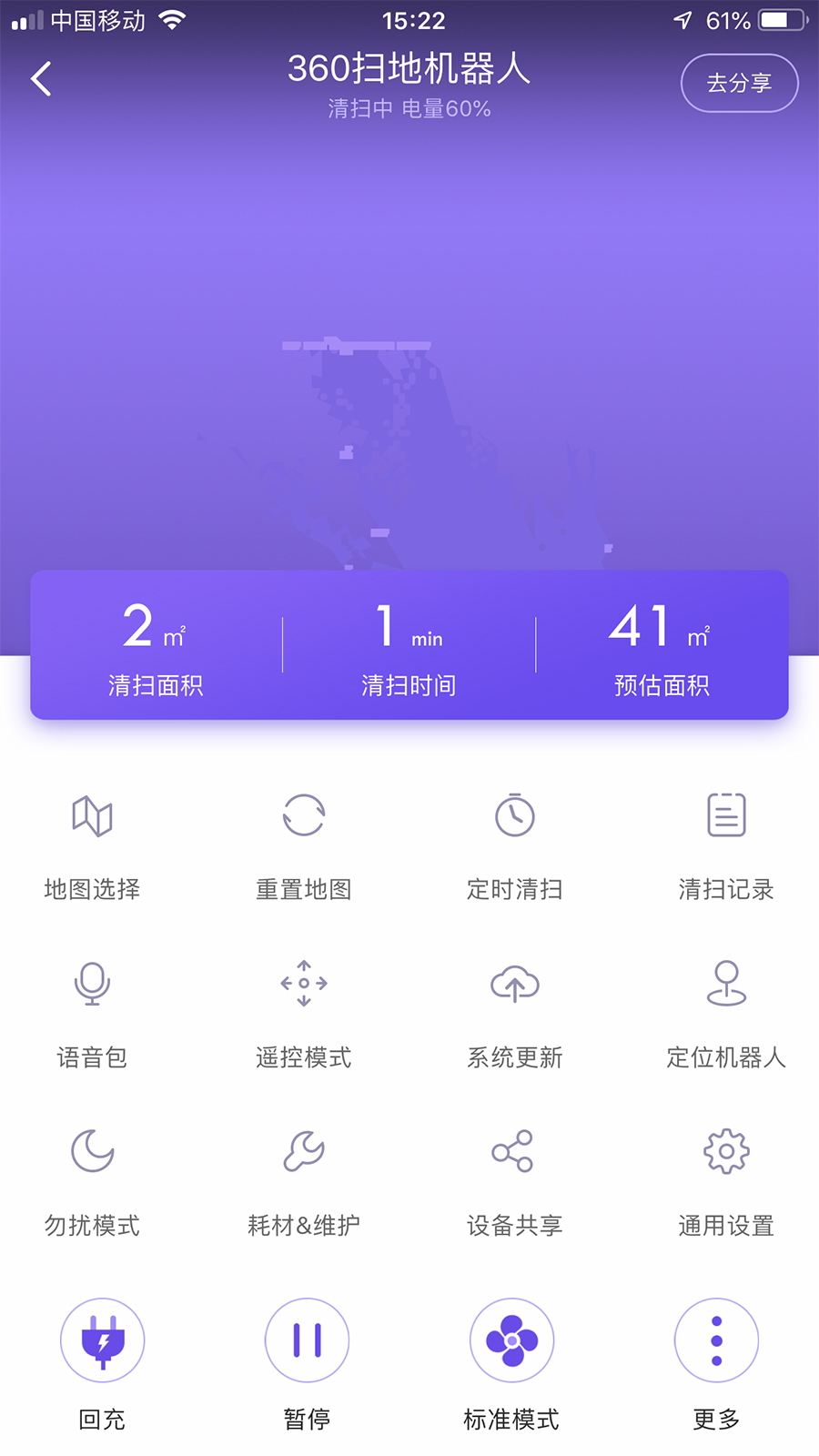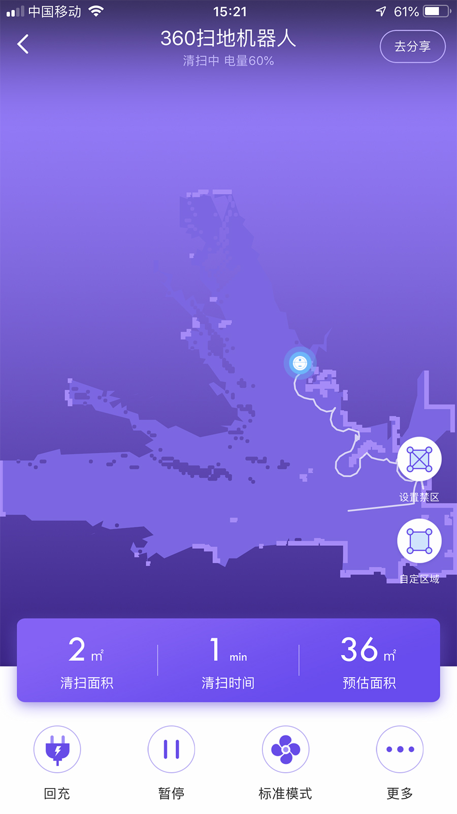 當然除了通過360智能這個APP啟動這臺掃地機器人進行自動清掃外,我們還可以手動遙控掃地機器人、設置相應的禁區(qū)、自定義清掃區(qū)域以及定時清掃進行個性化精細化的掃地清潔工作,可以說這個APP功能相當?shù)呢S富。